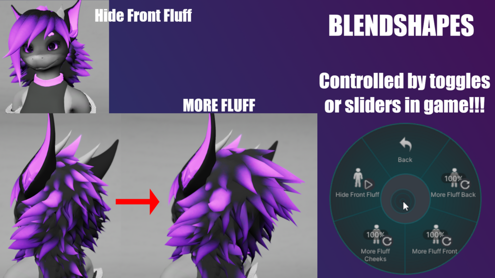 - Do not touch the blendshapes on the Fluff (they are automatically going to be the same as your body base and the extra ones have toggles or sliders)